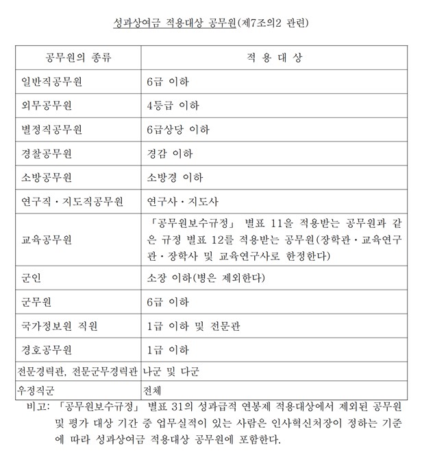 공무원 성과상여금 적용대상 중에서도 지급대상이 되는 공무원조건은 지급기준일 현재 해당기관에 소속되어 있는 공무원과 평가대상기간 중 퇴직한 공무원이 해당 됩니다. 지급기준일 현재 파견중인 자와 휴직(군입대 휴직자도 포함), 기타 사유로 직무에 종사하지 않고 있는 자도 지급대상에 포함하되, 지급기준일 현재 승진임용 후 2개월이 경과하지 않은 경우 승진 전 계급의 지급액을 받습니다.