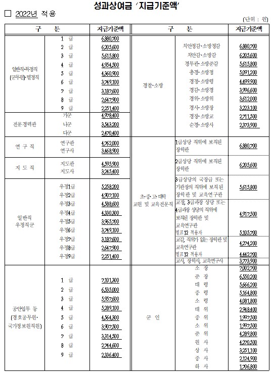 공무원 성과상여금의 지급기준액은 얼마인지 궁금하실텐데요. 2022년을 기준으로 말씀드리면 일반직 9급 공무원의 경우 2,251,400원 8급 공무원 2,647,900원, 7급 공무원 3,187,600원 입니다. 지급기준액에 지급액의 퍼센트를 곱하면 해당등급에 대해 지급되는 성과상여금이 나옵니다.