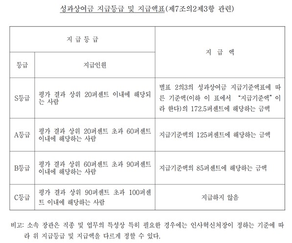 공무원 성과상여금은 등급에 따라 차등으로 지급됩니다. 평가결과 S등급(상위 20%이내)에 해당되는 사람은 지급기준액의 172.5%에 해당하는 금액을 받을 수 있으며 A등급(상위20%~60%)은 지급기준액의 125%, B등급(상위60%~90%) 지급기준액의 85%, C등급(상위(90%~100%)은 지급되지 않으나 소속장관은 업무의 특성상 필요한 경우 인사혁신처장이 정한 기준에 따라 지급등급 및 지급액을 다르게 정할 수 있습니다.